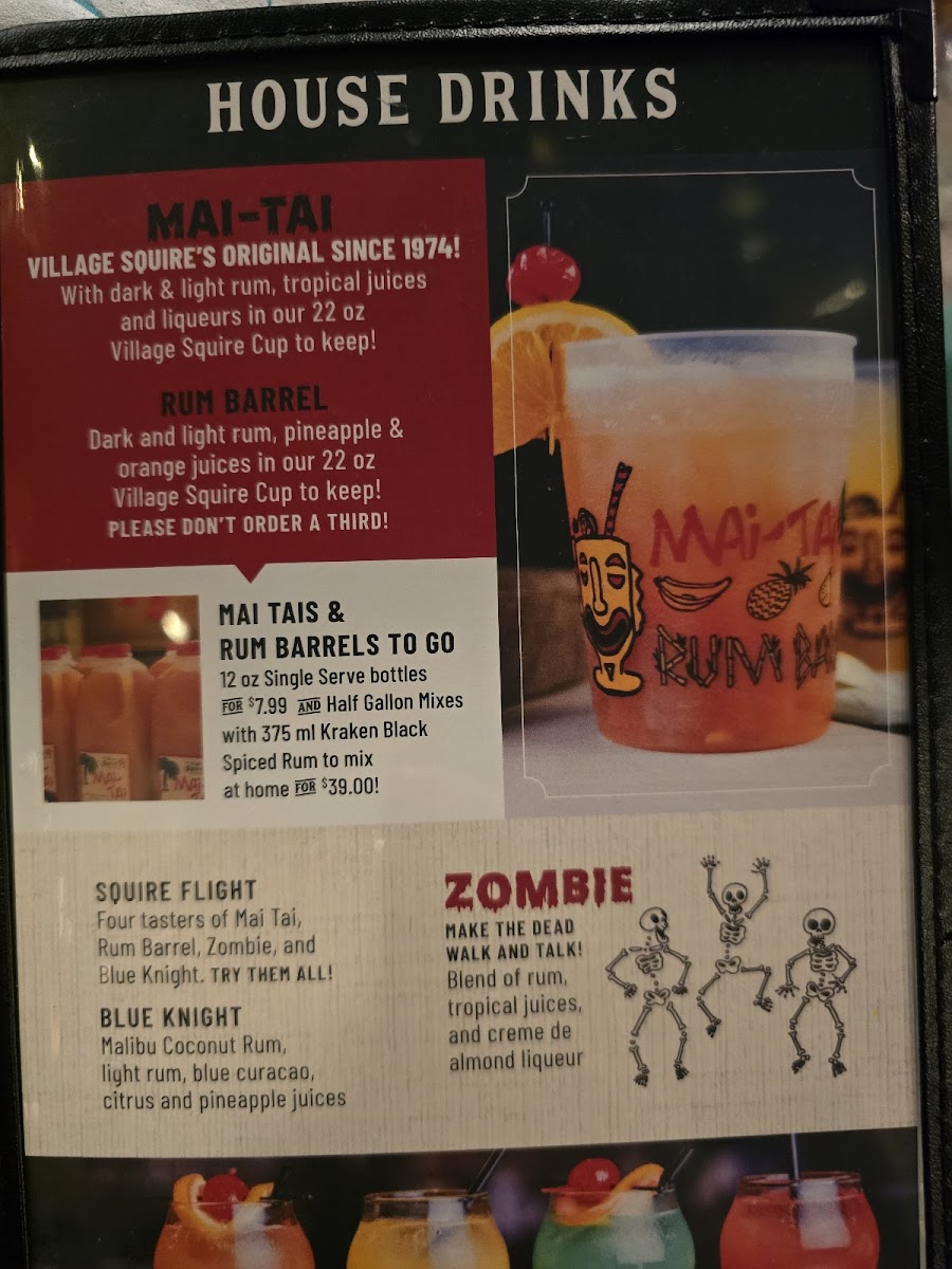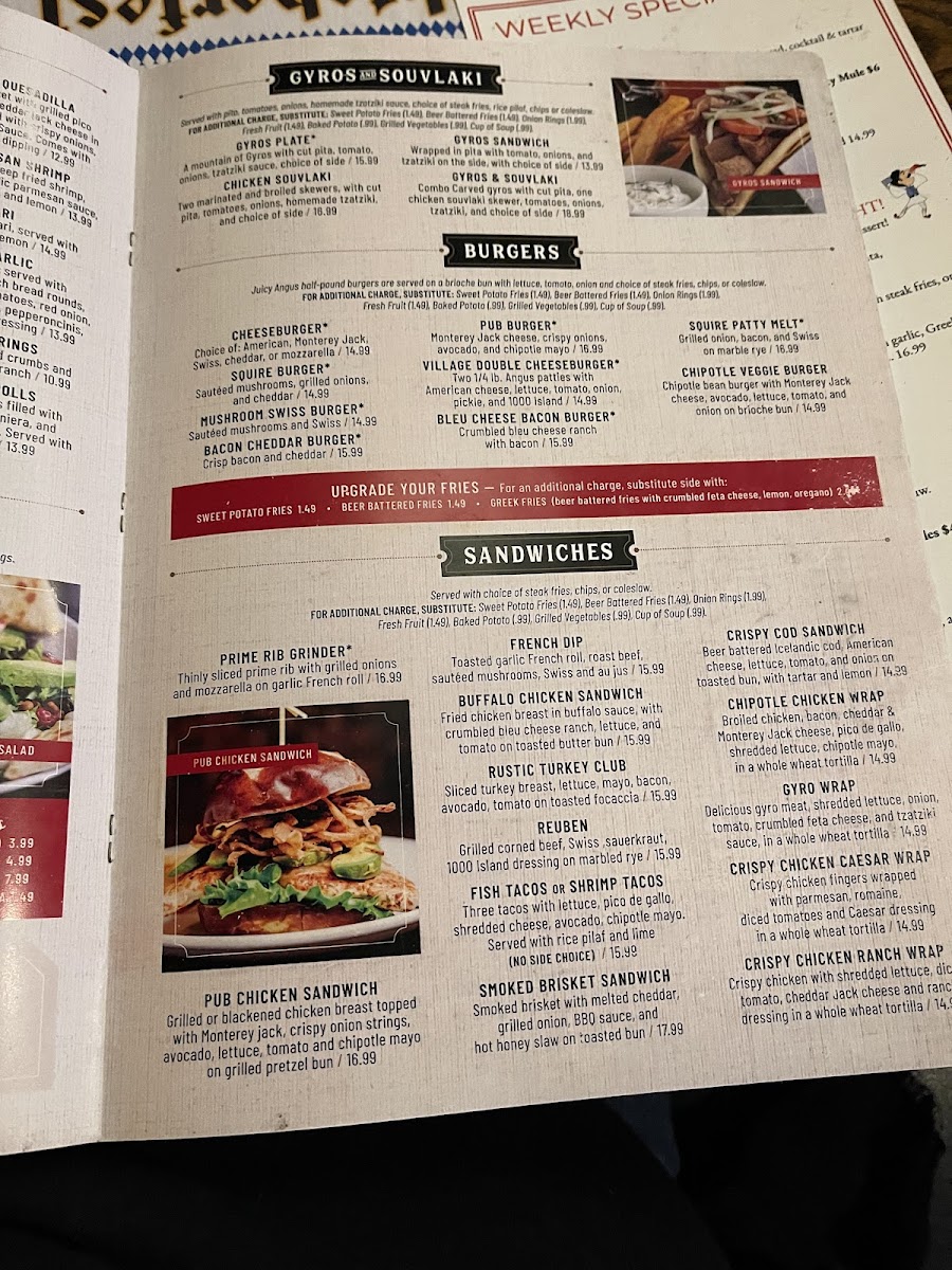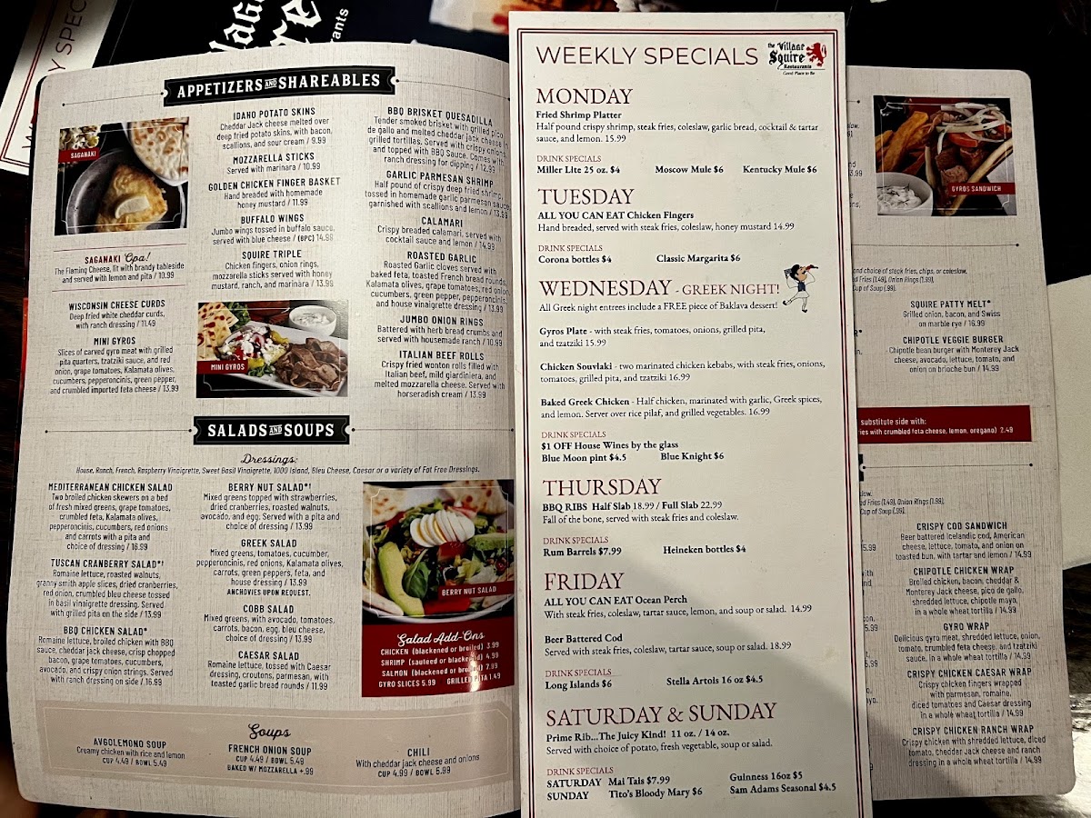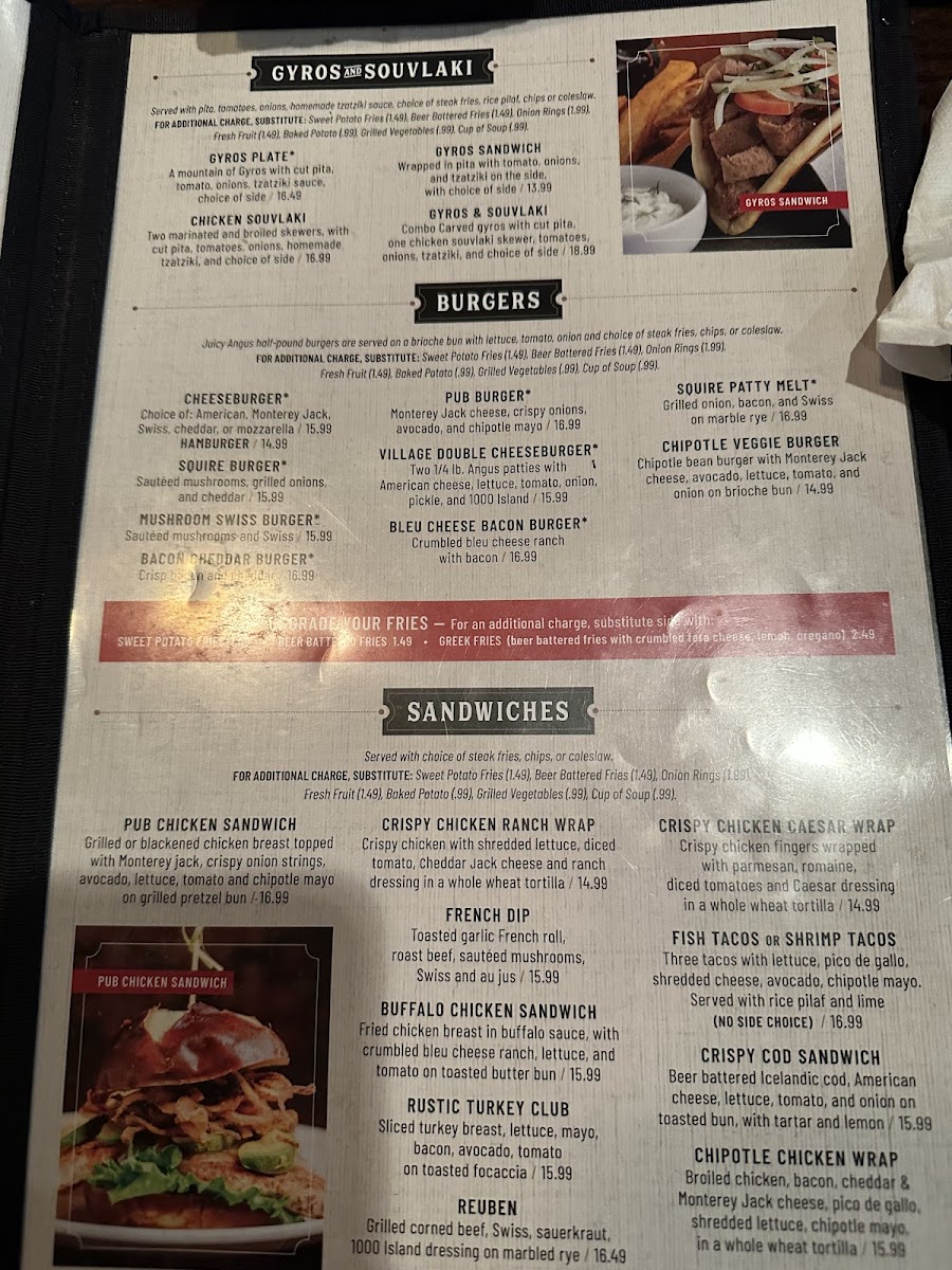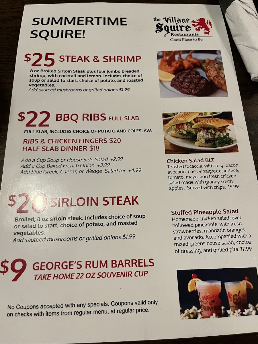 Village Squire McHenry favorite: Thinly sliced prime rib, with grilled onions and Mozzarella, on a toasted French roll. Served with choice of steak fries, chips, or coleslaw.