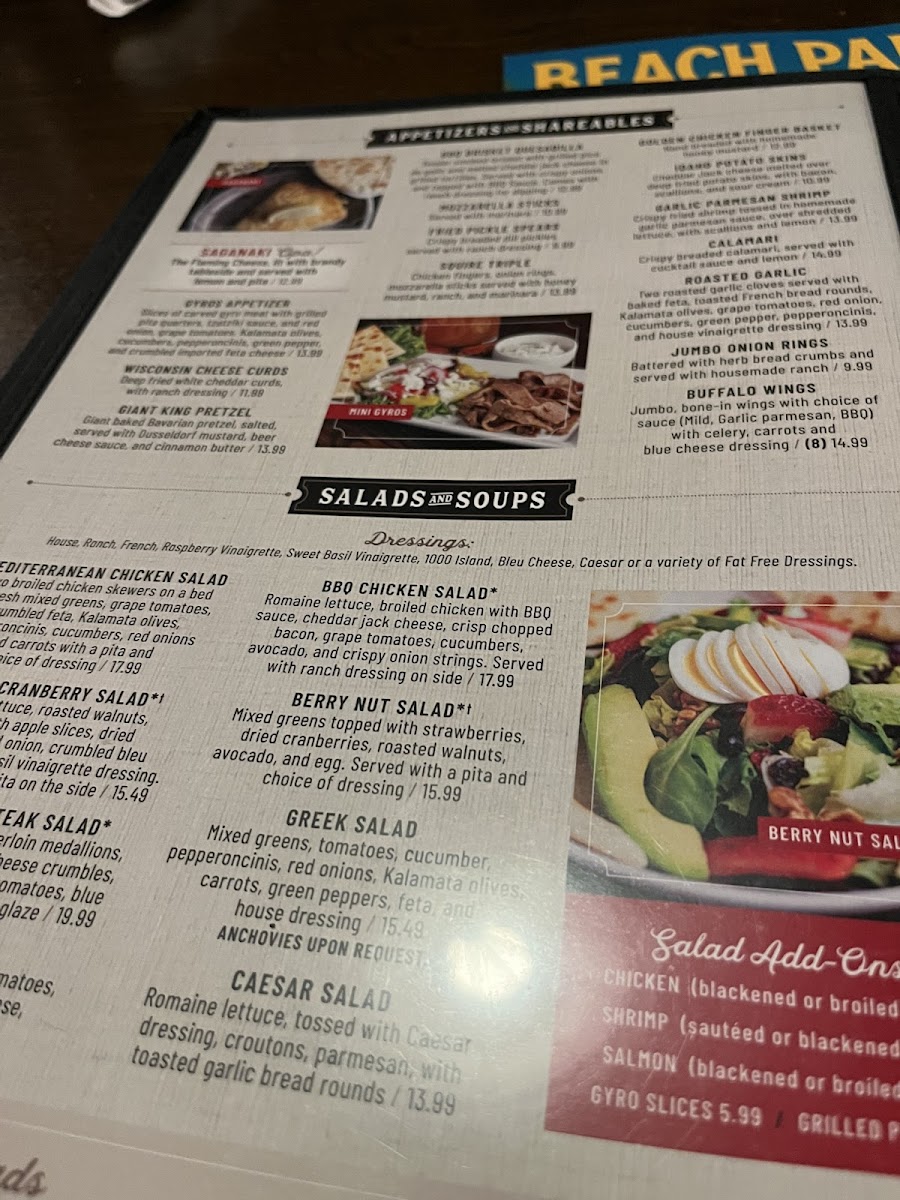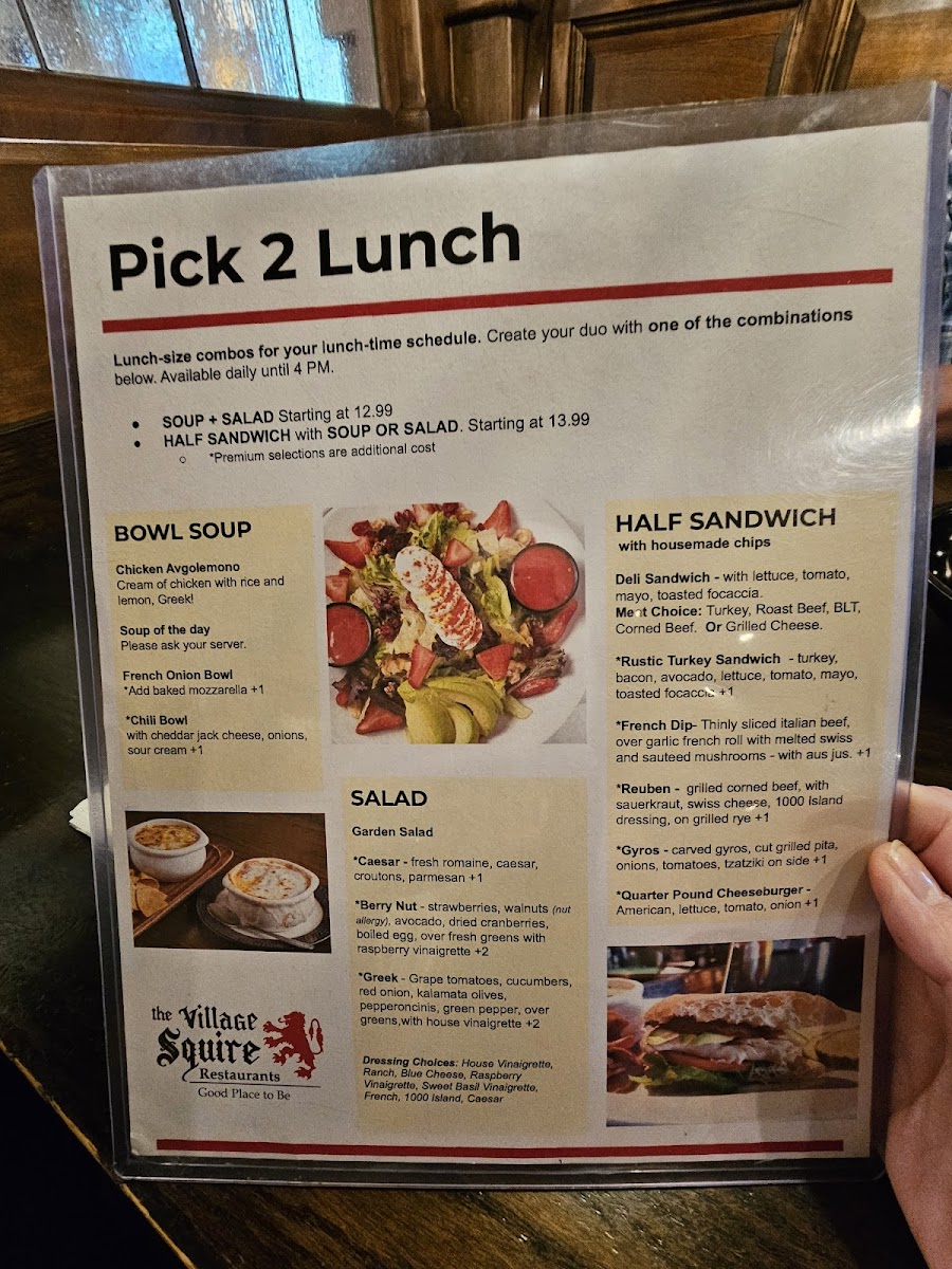 Village Squire McHenry favorite: Mixed greens topped with strawberries, dried cranberries, roasted walnuts, avocado, and egg. Served with a pita and choice of dressing.